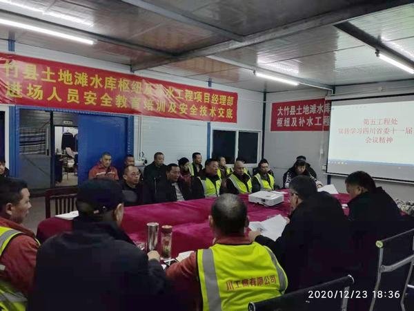 2020年12月23日,第五工程處在承建的大竹縣土地灘水庫樞紐及補水工程項目部召開職工大會,宣傳學習四川省委十一屆八次全會精神和周永開等全國優秀共 產 黨員先進事跡及中共中央、國務院關于表彰全國勞動模范和先進工作者的決定。會議由第五工程處處長陳道剛主持。