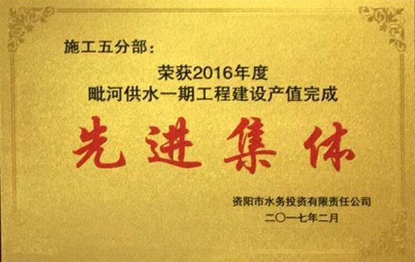 2017年2月17日,業主在資陽市委黨校組織業主管理部門、設計、監理、施工、移民等單位召開2016年度毗河供水一期工程建設管理工作會,局毗河工程項目部在評比中獲得2016年度毗河一期工程建設產值第一名(先進集體),四處副處長兼項目部常務副經理羅茂林、總工程師張亮亮獲得2016年度生產先進個人榮譽稱號,為工程局贏得了榮譽。