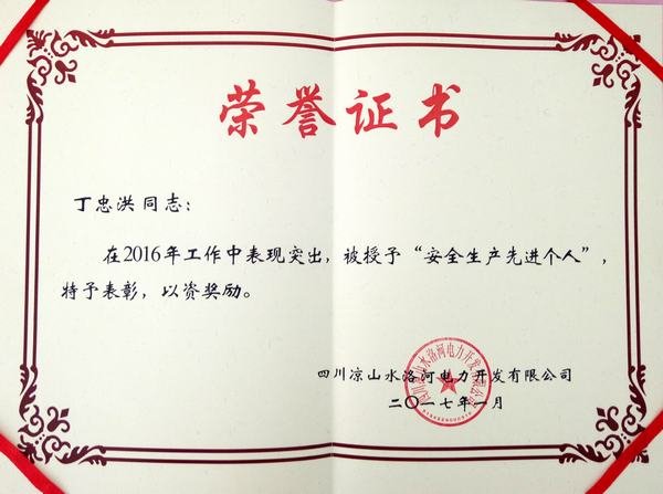 丁忠洪、吳畏二同志在2016年度的現場生產過程中,除了積極協助項目經理抓進度、抓質量,對生產安全工作也毫不放松。每天習慣性的安全巡查,對生產現場不文明施工、各種習慣性違章,他都會及時要求進行改正;對發現的安全隱患也及時進行排除,雖然很多安全事件的處理,表面看起來普普通通,但正是因為丁經理這種兢兢業業的工作方式以及對待安全工作無小事的態度,奠定了固滴首部樞紐工程2016年全年無人身傷亡事故發生,無設備事故發生,無火災事故發生等,其它事故均為0次的工作成績。