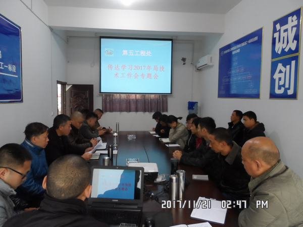 2017年11月21日下午,第五工程處在安岳縣關(guān)刀橋水庫(kù)灌區(qū)一標(biāo)段項(xiàng)目部會(huì)議室召開專題會(huì)議,傳達(dá)學(xué)習(xí)2017年局第十三次技術(shù)工作會(huì)議精神。會(huì)議由處長(zhǎng)陳道剛主持。
