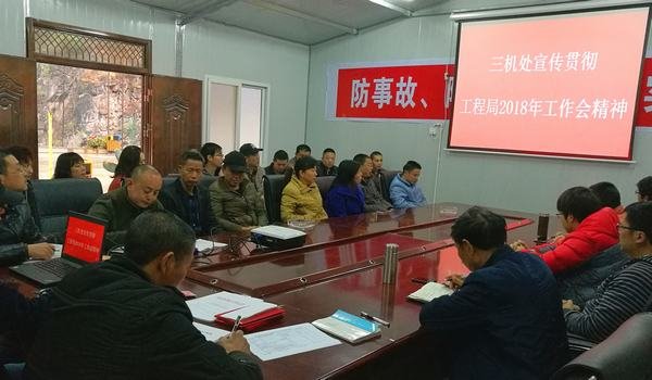 2018年4月6日晚,三機處在博瓦電站項目部組織全處職工學習貫徹工程局2018年工作會議精神,會議由處長薛斌主持。