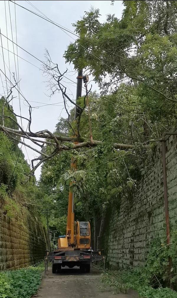 2020年8月28日晚,一場突如其來的狂風(fēng)暴雨席卷資陽,導(dǎo)致城區(qū)多處樹木斷裂倒伏!29日一早,公司馬鞍山設(shè)備倉庫值守人員向公司機電設(shè)備處副處長張尚明報告,倉庫入庫道路右側(cè)堡坎上方公司宿舍區(qū)房屋外一顆大樹被風(fēng)吹倒后橫壓在出庫的電力線路上,存在重大安全隱患。了解現(xiàn)場情況后,張尚明立即安排值守人員關(guān)閉出庫線路的電源,以防止電線被壓斷導(dǎo)致出現(xiàn)觸電事故,并同時趕往現(xiàn)場處置。