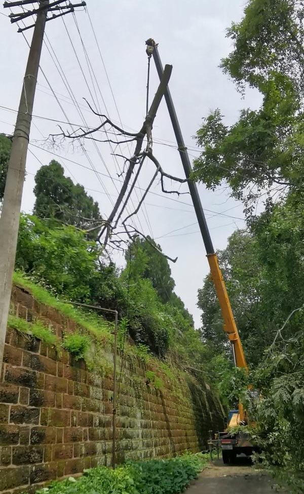 經(jīng)現(xiàn)場查看,倒伏的樹木早已枯死,根部腐爛斷裂。上部枝干全部壓在出庫線路上,電線由于承重已大幅下垂;如不及時處理,電線極有可能因承受重載而斷裂;在電線另一段,也有一顆樹木受狂風(fēng)影響,倒在電線上。由于該段線路為馬鞍山倉庫片區(qū)公司老職工住戶和多戶生產(chǎn)經(jīng)營用戶進行供電,停電后,對其正常生活和生產(chǎn)經(jīng)營造成影響。為盡快消除安全隱患,減少損失,及早恢復(fù)供電,須立即對該情況進行處置。