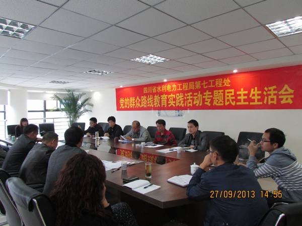 9月27日,七處在都江堰市局水利大廈六樓會議室召開了黨的群眾路線教育實踐活動專題民主生活會。局黨委副書記、紀委書記高本祥、勞人處處長舒建國,黨辦主任夏永紅應邀蒞臨指導。七處班子成員、科室負責人、黨員及職工代表參加了會議。會議由七處黨支部書記蔡書江主持。