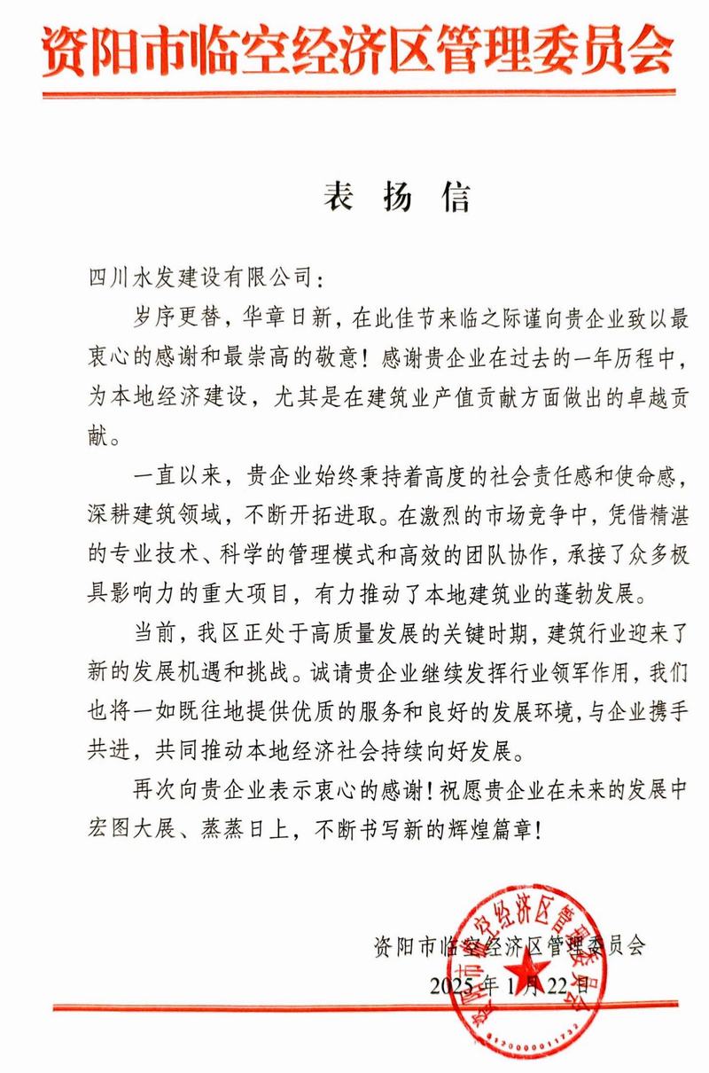 1月24日,公司收到資陽市臨空經濟區管委會發來的表揚信,信中對公司在2024年度為本地經濟建設,尤其是在建筑業產值方面的卓越貢獻予以充分肯定。