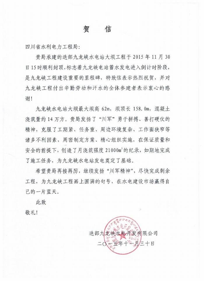 隨后,甘肅九龍峽公司董事長楊利民和引大監理公司總監徐全明分別致辭,并向工程局致賀信祝賀。