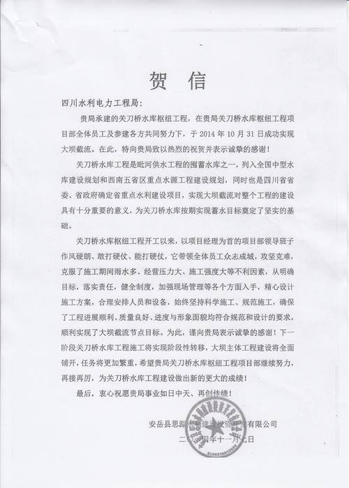 安岳縣思源水利建設投資開發有限公司致工程局賀信