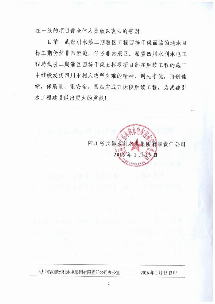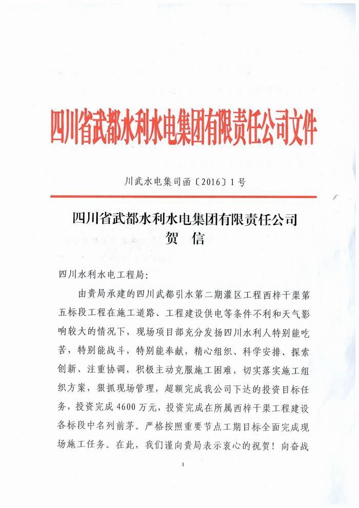 四川省武都水利水電集團有限責任公司致工程局賀信