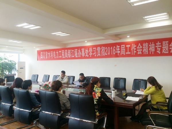 2016年4月12日上午,局都江堰辦事處在水利大廈三樓會議室召開專題會議,學習貫徹工程局2016年工作會精神。會議由都江堰辦事處黨支部書記、工會主席孫代華主持,辦事處全體職工參加會議。
