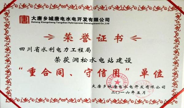 2016年5月10日16時,大唐鄉城唐電水電開發有限公司在鄉城縣召開了簡潔而隆重的“碩淉電站投產發電先進表彰大會”,四川省水利電力工程局榮獲洞松水電站建設“重合同、守信用”單位榮譽稱號,項目經理毛偉榮獲洞松水電站建設“優秀項目經理”榮譽稱號。
