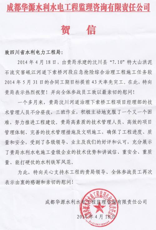 成都華源水利水電工程監理咨詢有限責任公司致工程局賀信