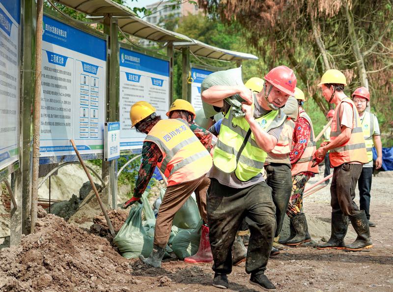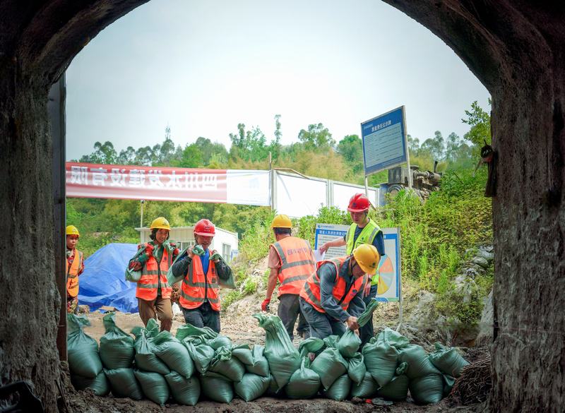 本次演練模擬威遠縣境內遭遇強降雨天氣,降雨量在短時間急劇上漲,渠道上游來水即將漫入冒殼山隧洞施工現場,面對這一“突發狀況”,項目部立即啟動應急預案,各小組迅速響應,分工明確,有條不紊地開展搶險工作。在搶險過程中,搶險人員緊密配合,將裝滿粘土的沙袋依次堆疊,對隧洞口進行封堵;經過爭分奪秒的奮戰,隧洞口成功完成搶險封堵,應急處置任務圓滿結束。